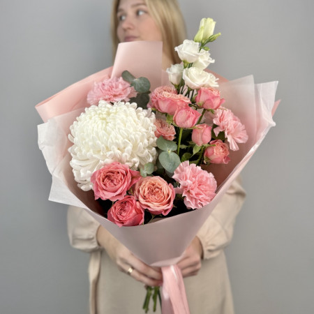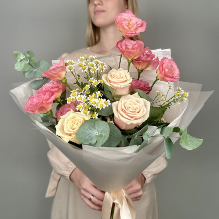 Роза кустовая - 2 шт., Эустома - 1 шт., Лента атласная - 1 шт., Хризантема одноголовая - 1 шт., Современная упаковка - 1 шт., Эвкалипт большой - 1 шт., Гвоздика одноголовая цветная - 3 шт.Доставка 0₽ от 30-ти минут