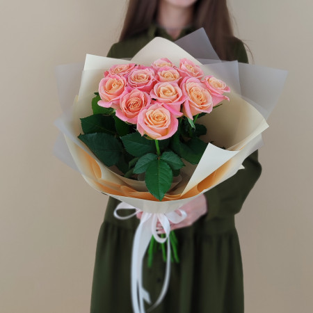 Роза кустовая - 6 шт., Роза Мисс Пигги (50см) РОССИЯ - 11 шт., Современная упаковка - 1 шт., Лента атласная - 1 шт.Доставка 0₽ от 30-ти минут