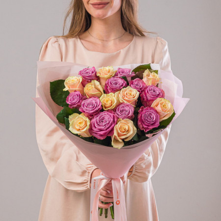 Лента атласная - 1 шт., Современная упаковка - 1 шт., Роза кустовая - 15 шт.Новая коллекция