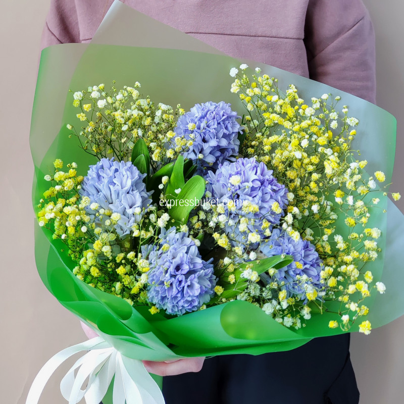 Гиацинт срез - 5;Гипсофила - 2;Современная упаковка - 1;Лента атласная - 1;