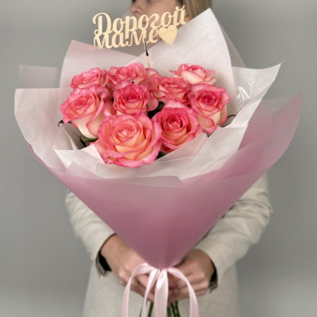 Современная упаковка - 1;Лента атласная - 1;Хризантема кустовая розовая - 3;Гербера - 3;Роза кустовая пионовидная - 4;Современная упаковка - 1;Лента атласная - 1;Самшит - 2;
