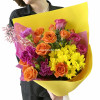 Роза 50 см РОЗОВАЯ (Кения) - 3;Хризантема кустовая желтая - 1;Фисташка - 3;Роза кустовая - 2;Гвоздика одноголовая цветная - 3;Иглица - 1;Упаковочный материал - 1;Лента атласная - 1;